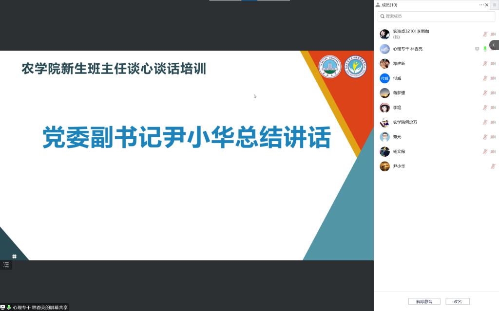 (通讯员 李虹晓)为加强重点学生管理工作,精准发现心理预警学生和心理潜在危机,充分做到早发现、早报告、早处置, 9月28日上午,农学院召开新生班主任谈心谈话培训。党委副书记尹小华、新生辅导员何忠万、全体新生班主任参加会议,心理专干林香亮主持。
