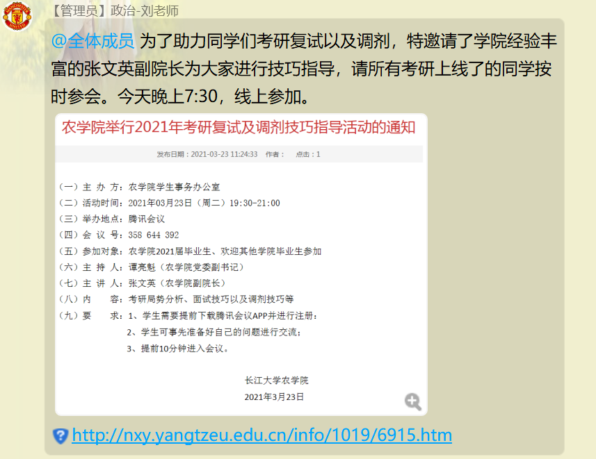 通讯社讯(通讯员 胡勇)为了提高考研学生的复试成功率和掌握调剂技巧,3月23日晚7:30,农学院利用“腾讯会员”平台,诚邀我院副院长张文英教授与100多名研究生进行线上对接,为即将毕业的研究生在考试复试和调剂技巧方面给予宝贵建议。该活动由学工办主任刘庆开展,党委副书记谭亮魁主持。