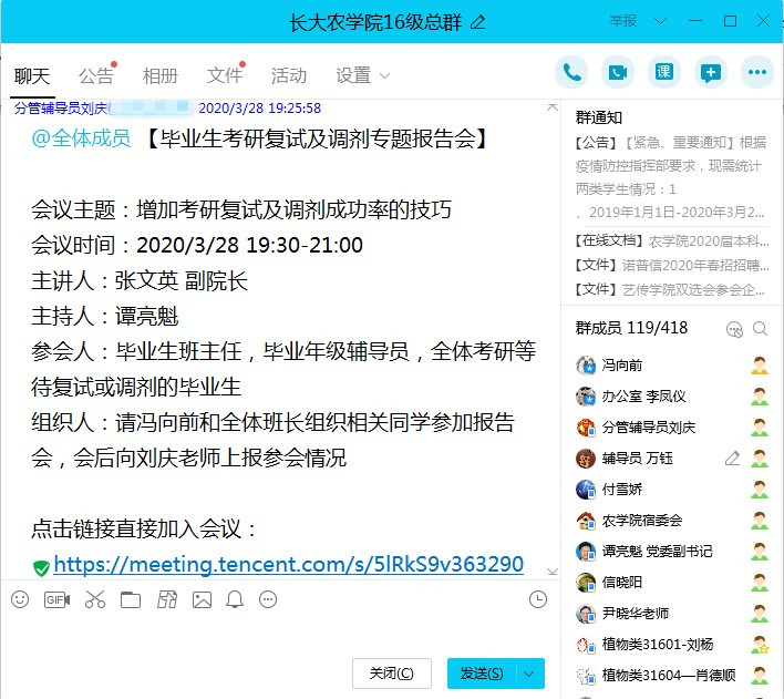 通讯社讯(通讯员 刘庆)为了提升毕业生考研复试与调剂成功率,3月28日19:30,农学院利用“腾讯会议”平台,特邀分管教学副院长张文英与110名考研毕业生进行线上交流,为毕业生的考研复试与调剂指点迷津,毕业生班主任、年级辅导员参加报告会。报告会由党委副书记谭亮魁主持。
