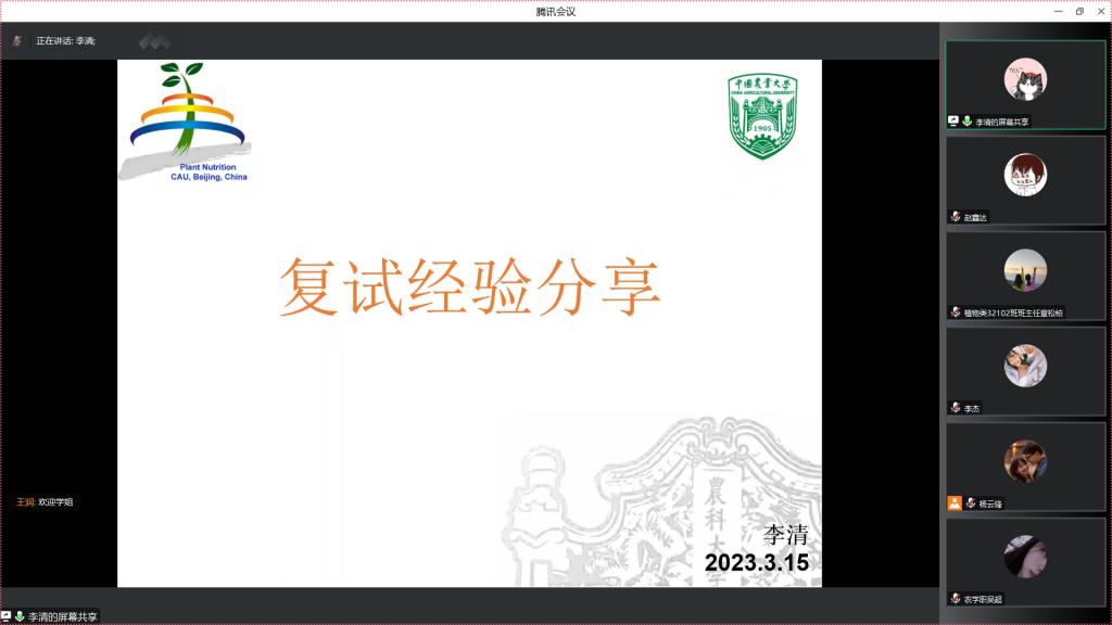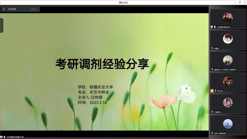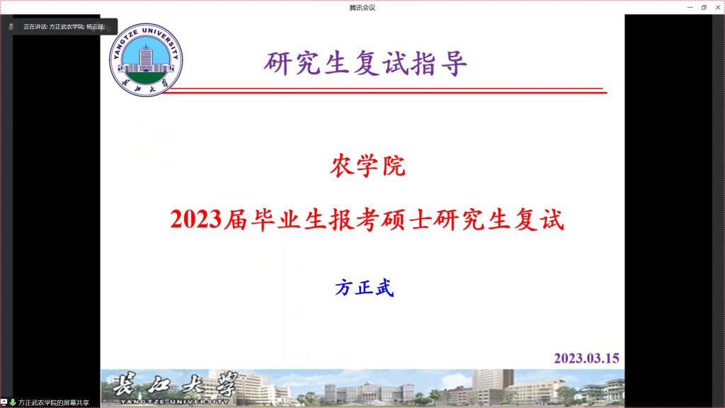 (见习记者 谢诗琳 赵鑫达)为进一步提高我院学生考研的热情,明确考研目标,了解相关考研政策,掌握相关考研复试技巧,3月15日19:00,我院通过腾讯会议召开农学院2023届本科生考研复试经验分享会。副院长方正武、2023届考研学生及2020级有考研意向学生参加此次会议,会议由学工办主任杨云锋主持。