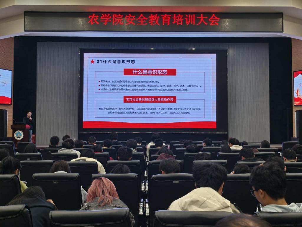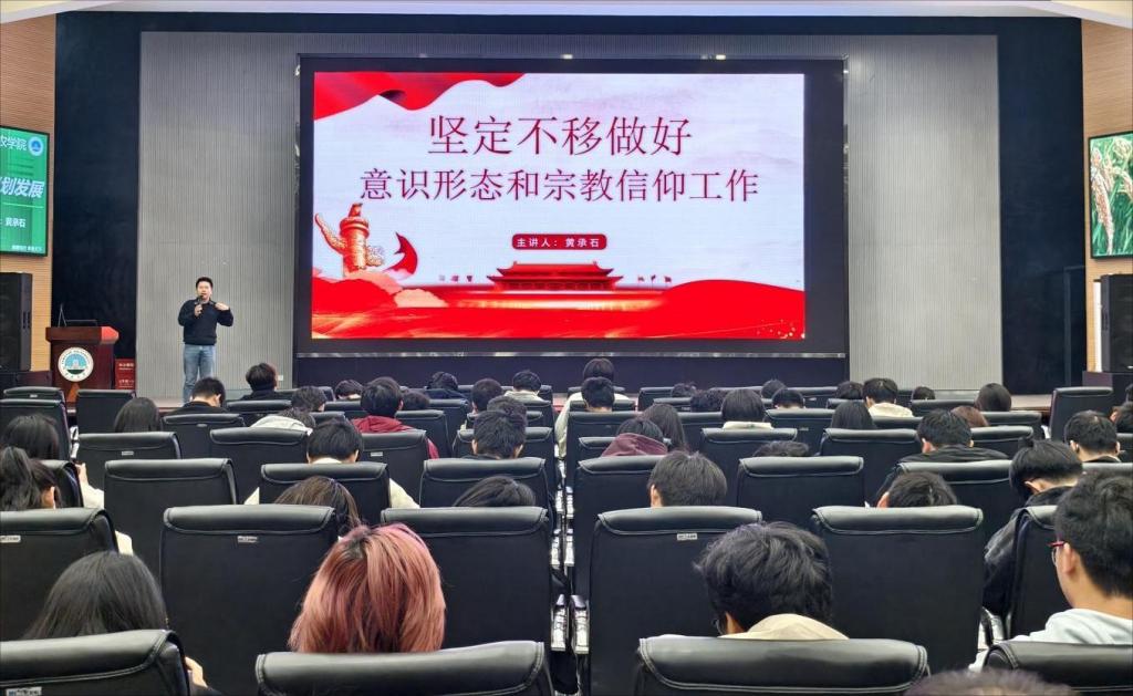 (通讯员 吴泓萱 张源康/文 胡雪晴 向建华/摄)为切实强化学子意识形态认知,提升安全防范综合能力,引导青年学子树立正确宗教观与国家安全观,11 月 11 日,农学院在农科大楼 1058 报告厅面向 2025 级全体新生举办意识形态暨安全教育专题讲座。本次讲座由学工办主任黄承石主讲,为新生们带来了一堂兼具理论深度与实践指导意义的思想安全必修课。