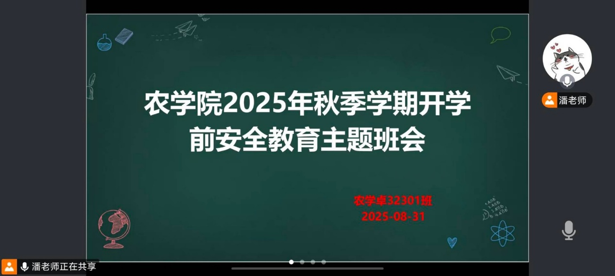 (通讯员 吴淑洋)为切实做好2025年秋季学期学生返校安全工作,增强学生安全意识,筑牢校园安全防线,保障新学期各项工作平稳有序开展。近日,农学院以班级为单位,通过线上会议形式全覆盖组织召开2025秋季开学返校安全教育会议。全院各班级班主任全程参与,围绕返校流程、安全须知、健康防护等内容进行详细讲解,为学生顺利返校保驾护航。