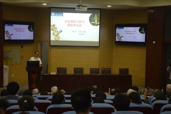 长江大学农学院教授马东方为转基因科普作专题报告。报告以丰富的案例、详实的数据,讲授了“什么是转基因”、“全球转基因技术发展趋势”、“转基因食品是否安全”等转基因知识,引导师生和社区居民培养理性思维,科学认知转基因技术。